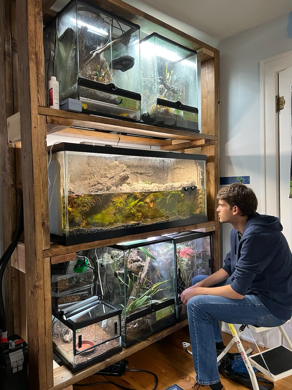 “Just exploring the woods as a kid,” he said. “I would catch frogs and snakes and turtles. That's what was around. I didn't catch birds or mammals, it was lizards and stuff. I brought home a frog that I found in the woods, which is really bad to do. But I was like 7 years old. And since then, I became really passionate about making the habitats and designing the little worlds for them.”