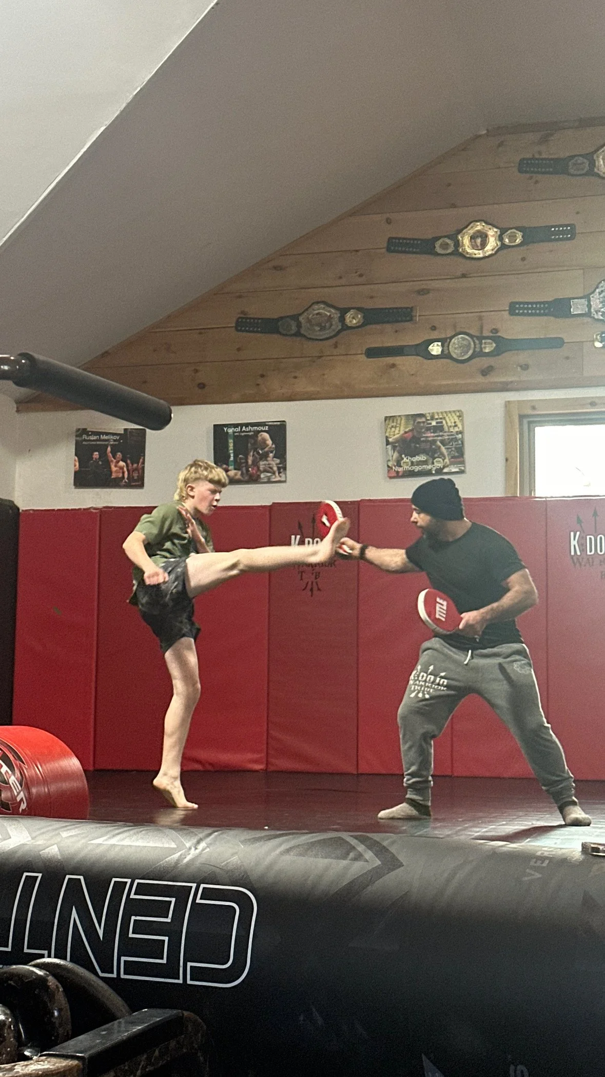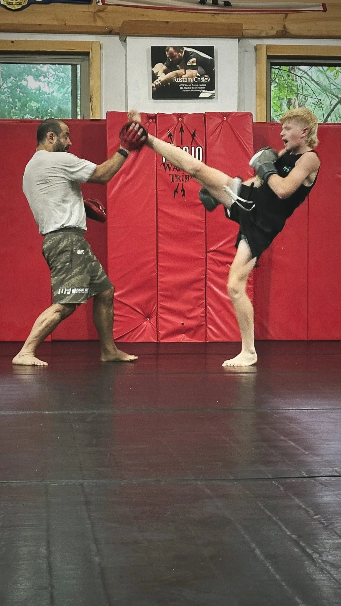 Chaning Hommel kicks high during a training session with coach Murat Keshtov. Photos submitted